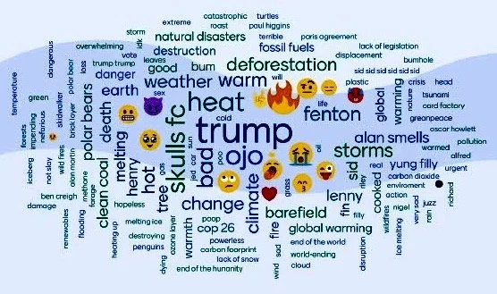 The most frequent word, sadly and alarmingly, was “Trump”. Most responses indicated a serious engagement with climate change. Some students were clearly extremely anxious. There were a few jokey, or rude, responses and perhaps some of these also indicate a challenging anxiety. Many emojis also appeared – are they eliminating written language?